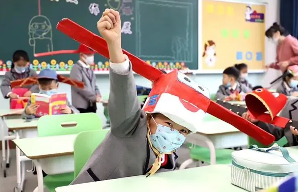 Algunos alumnos chinos regresan a las aulas utilizando gorros especiales para mantener la distancia de seguridad. Imágenes de la escuela primaria Yang Zheng.