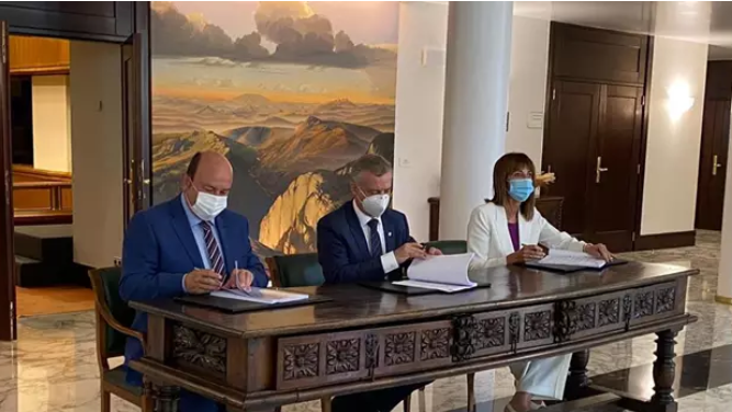 El Lehendakari, Iñigo Urkullu, el presidente del Euzkadi Buru Batzar, Andoni Ortuzar, y la secretaria general del PSE-EE, Idoia Mendia, rubricaron ayer al mediodía el pacto para la conformación de un Ejecutivo de coalición.