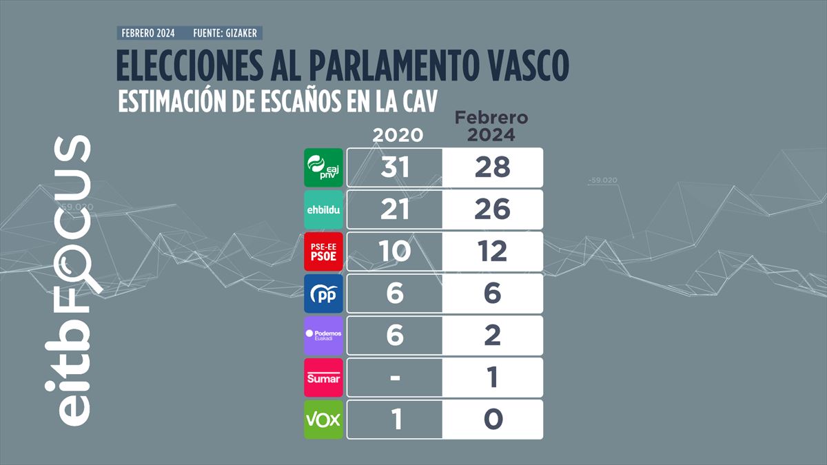La formación jeltzale conseguiría un total de 28 parlamentarios y un apoyo del 35,8% del electorado, lo que supondría una pérdida de 3 representantes y 3,3 puntos en votos en comparación con los últimos comicios de 2020. Por el contrario, la coalición abertzale mejoraría en 5 asientos, hasta los 26, y en 4,2 puntos en sufragios, hasta un 32,1%.El tercer puesto sería para el PSE-EE, con 12 escaños. Así los socialistas aumentarían su representación en 2, al pasar del apoyo del 13,7% logrado hace cuatro años a un 14,8% previsto en las próximas elecciones.Por su parte, el PP conservaría su número de escaños actual, 6, pero con un suave aumento en votos de medio punto.En cuanto a Podemos, si no alcanzara un acuerdo para concurrir en coalición, la formación morada superaría a Sumar Mugimendua y conseguiría el 4% de los sufragios y 2 parlamentarios, mientras que la formación de Lander Martínez se haría con un escaño y el 3,2% de los votos. En las últimas eleccione, la coalición logró 6 parlamentarios.Por último Vox perdería a su única representante al obtener el 1,6% de los votos, 0,4 puntos menos.