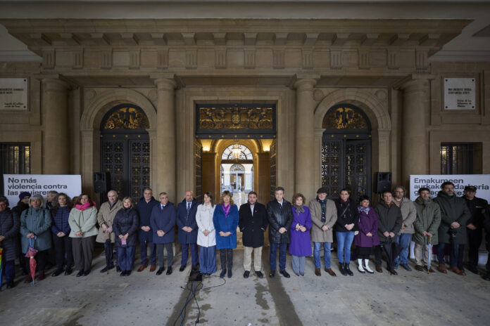Nafarroako Parlamentuko presidente, Unai Hualde, eta Foru Gobernuko kontseilariek elkarretaratzea egin dute Nafarroako Jauregiaren aurrean, azaroaren 25a dela eta. Ana Ollo bigarren lehendakariordea eta Memoria, Bizikidetzako, Kanpo Ekintzako eta Euskara kontseilariak eta Begoña Alfaro hirugarren lehendakariordea eta Etxebizitzako, Gazteriako eta Migrazio Politiketako kontseilariak irakurri dute Nafarroako Gobernuak aldarrikapen egun horren harira onartutako adierazpen instituzionala, euskarazko eta gaztelaniazko bertsioetan.