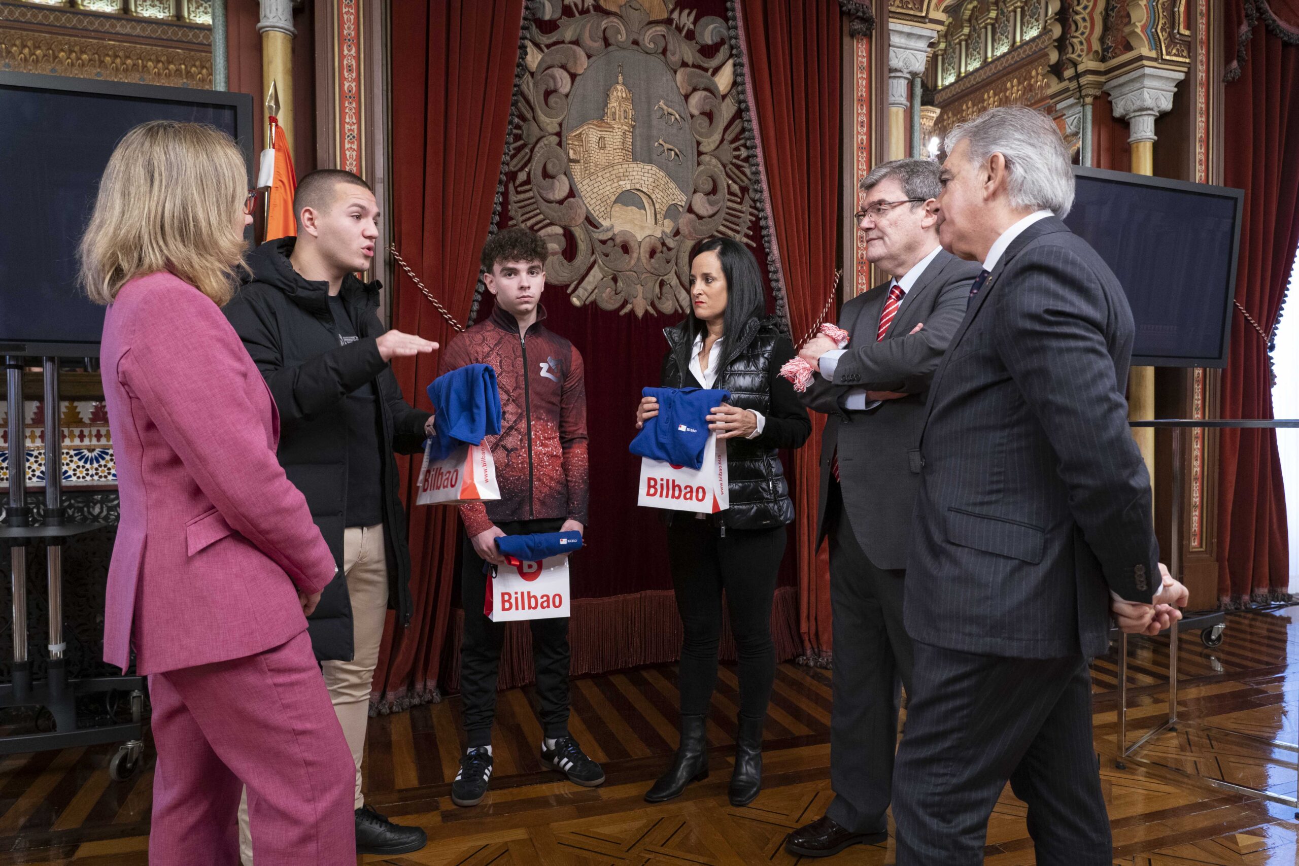 El Alcalde de Bilbao, Juan Mari Aburto, acompañado de la Concejala de Juventud y Deporte, Itxaso Erroteta, ha recibido en el Salón Árabe del Ayuntamiento de Bilbao a la ciclista Ziortza Villa, al boxeador Jokin García y al patinador Andoni Ibarra. Juan Mari Aburto ha departido con ellos sobre sus últimos triunfos. Todos ellos han agradecido el apoyo de Bilbao Kirolak en sus trayectorias.