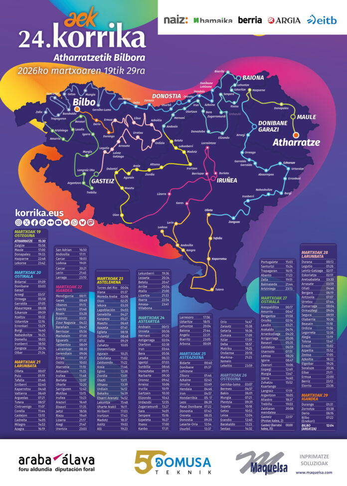 La edición número 24 de KORRIKA será la más participativa de la historia y ya tiene recorrido. Tendrá 2175 kilómetros y contará con 3436 relevos de testigo. En esta ocasión, la iniciativa a favor del euskera partirá de Atharratze el 19 de marzo y, tras recorrer durante once días toda Euskal Herria, finalizará en Bilbo el 29 de marzo, tras pasar por cerca de 460 pueblos. Todos los detalles acerca del itinerario pueden consultarse, en exclusiva, en la aplicación Korrika, así como en la web de Korrika. El plazo para reservar kilómetros, por su parte, comenzará el 1 de febrero.