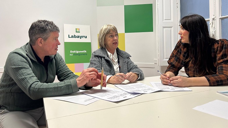 La diputada de Euskera, Cultura y Deportes Leixuri Arrizabalaga, el viceconsejero de Política Lingüística Aitor Aldasoro y la directora de Labayru Fundazioa Igone Etxebarria han dado a conocer el convenio marco que establece las bases generales de colaboración entre las tres instituciones.