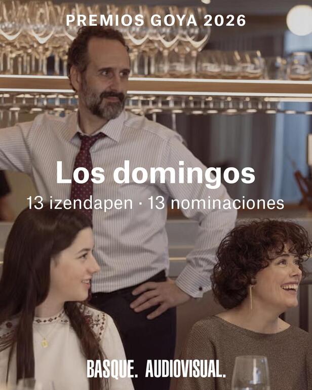 La producción cinematográfica vasca vuelve a situarse en primera línea de los Premios Goya al sumar 45 nominaciones repartidas en 23 categorías de la edición de 2026. Entre los títulos con mayor presencia figuran Los domingos, que encabeza la lista con 13 candidaturas, seguida de Maspalomas, con nueve, y Los tigres, con siete. La ceremonia de entrega tendrá lugar el próximo 28 de febrero en Barcelona, una cita en la que el audiovisual vasco aspira a consolidar el buen momento que atraviesa.