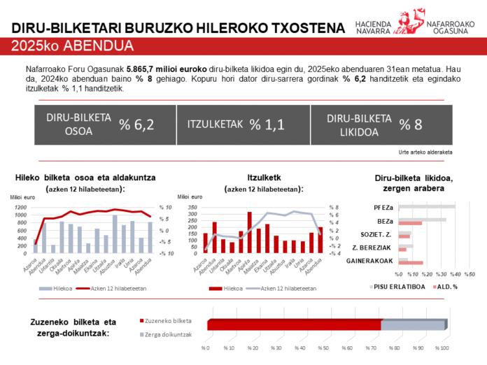 Nafarroako Foru Ogasunaren bilketa likido metatua, 2025eko metatuan, 5.865,7 milioi eurokoa izan zen, 2024an jasotako 5.433 milioi euroak baino 432,7 milioi euro gehiago. Zifra horrek urte arteko %8ko igoera adierazten du, bilketa osoan %6,2 gehiago eta itzulketetan %1,1 gehiago izatearen ondorioz. Adierazle makroekonomiko nagusien bilakaera onak zerga-portaera positibo hori lagundu du.