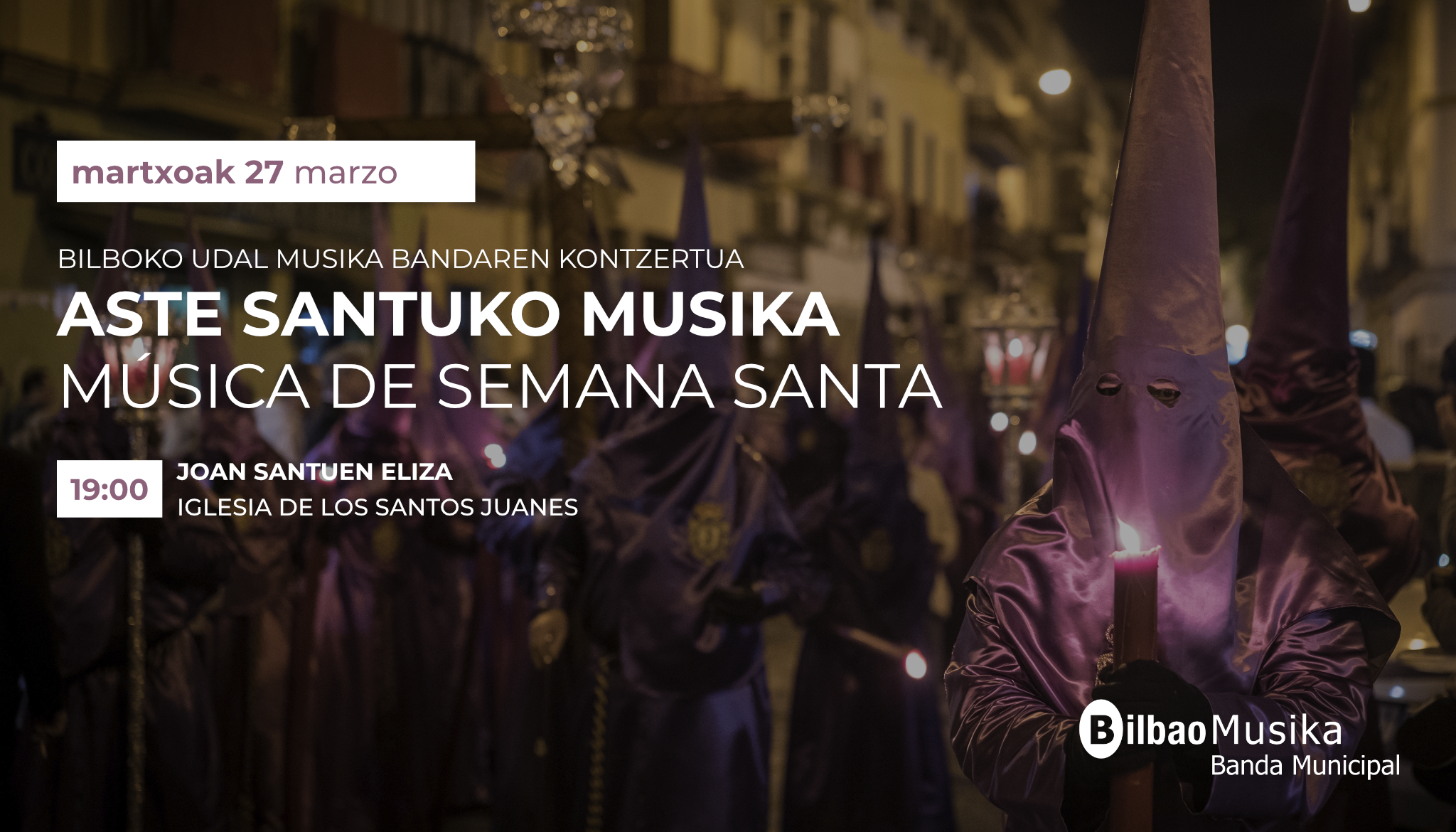 La Banda Municipal de Música de Bilbao ofrecerá el próximo viernes 27 de marzo, a las 19:00 horas, en la Iglesia de los Santos Juanes, el concierto “Música de Semana Santa”, una propuesta que invita al recogimiento y a la reflexión a través de un repertorio de gran intensidad emocional.