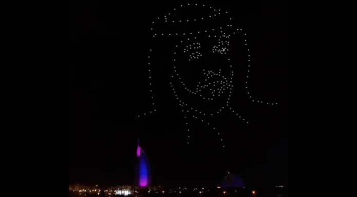 300 drones crean un espectáculo de luces en el cielo de Dubái y baten un Récord Guinness. Una academia de policía en los Emiratos Árabes Unidos celebró su 50 aniversario con un espectáculo que retrató los líderes del país y recrearon un mensaje de texto en árabe: “Gracias, Sheikh Mohammed”.