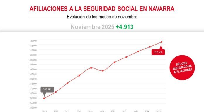 Foru Komunitateak beste marka bat ezarri du lanean ari diren pertsonen kopuruan batez besteko afiliazioa hazi egin da berriro Nafarroan. Hilabete arteko aldakuntzak %0,12 afiliazio gehiago ekarri ditu (382 afiliazio gehiago hilabete batean), eta 317.534 afiliaziorekin enpleguaren gehieneko maila historikoa lortu da bigarren hilabetez jarraian. 4.913 afiliazio hazi dira urtean (+%1,57).