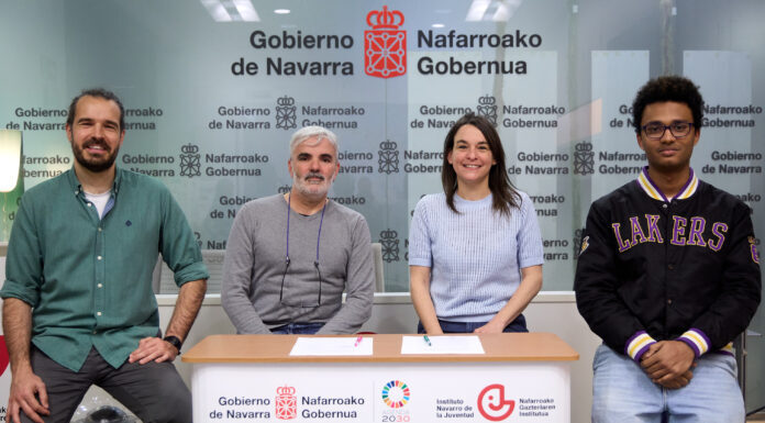 La vicepresidenta tercera y consejera de Vivienda, Juventud y Políticas Migratorias, Begoña Alfaro, y el presidente de la Coordinadora de ONGD de Navarra, Octavio Romano, renuevan el convenio para prevenir la desinformación y los discursos de odio. IÑIGO ALZUGARAY / GOBIERNO DE NAVARRA